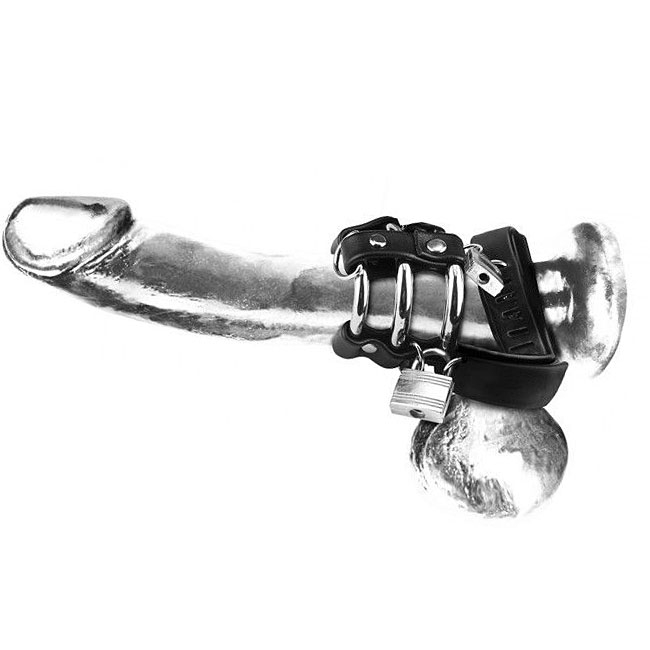 Комплект ремешков для мошонки и полового члена с 3 металлическими кольцами и 2 замочками, которые не позволяют снять изделие, пока хозяйка или господин не снимет замки, тем самым выпустив пленника наружу.